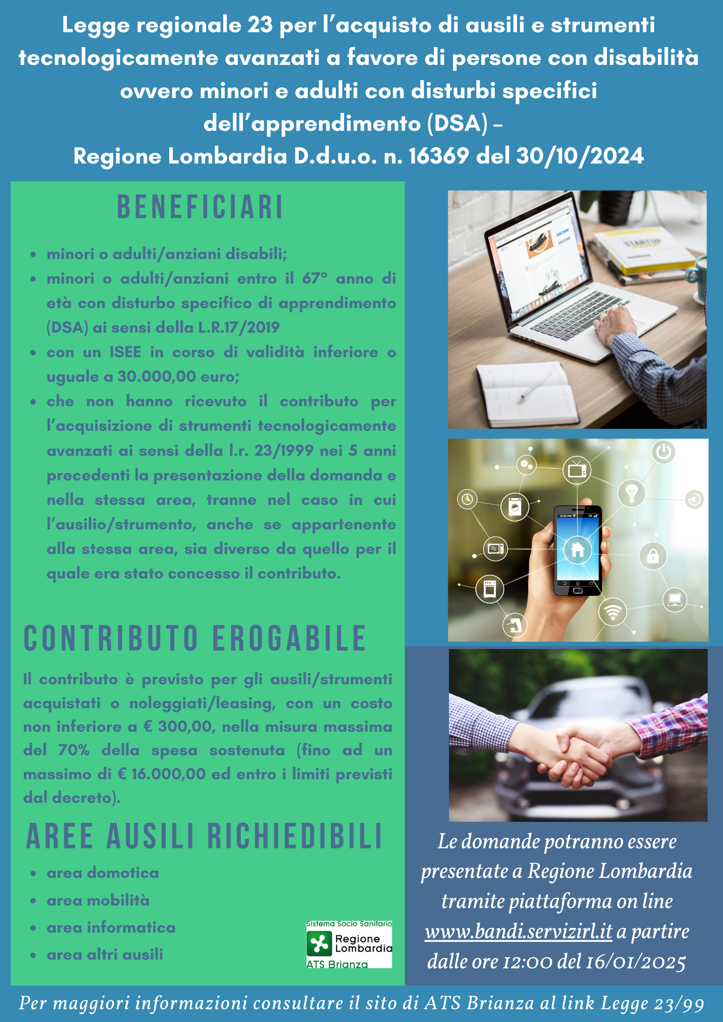 Con D.G.R. XII/3192 del 14/10/2024 e Decreto attuativo n. 16369 del 30/10/2024 Regione Lombardia ha previsto il rifinanziamento e la modifica della misura “Interventi a favore di persone con disabilità ovvero minori e adulti/anziani con disturbi specifici dell’apprendimento (DSA) per l’acquisizione di ausili o strumenti tecnologicamente avanzati”.
