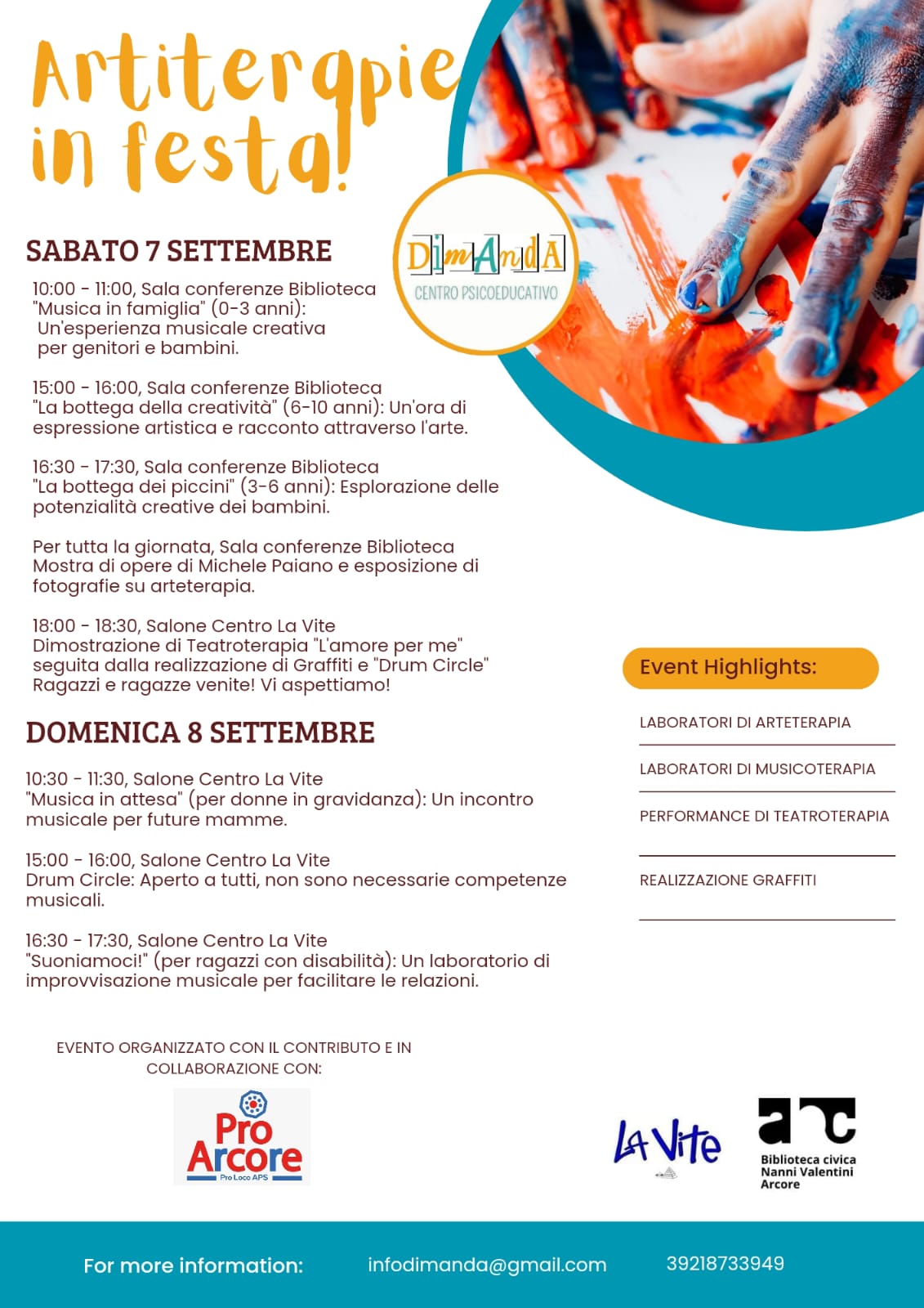 18.00 – 18.30 ”L’amore per me” dimostrazione di teatroterapia seguita dalla realizzaione di Graffiti e Drum Circle presso il salone del centro La Vite
