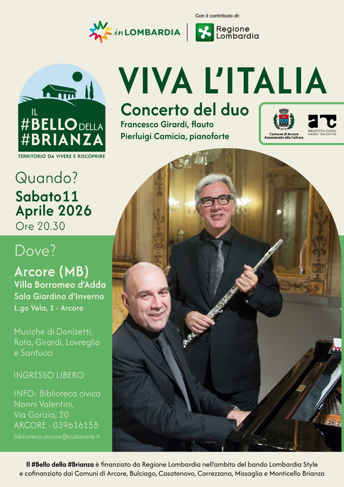 in occasione del “Il #Bello della #Brianza”, sabato 11 aprile 2026 ore 20:30 si terrà il Concerto “Viva l’Italia” del duo Francesco Girardi al Flauto e Pierluigi Camicia al pianoforte, presso la Sala del Giardino d’Inverno della Villa Borromeo d’Adda.