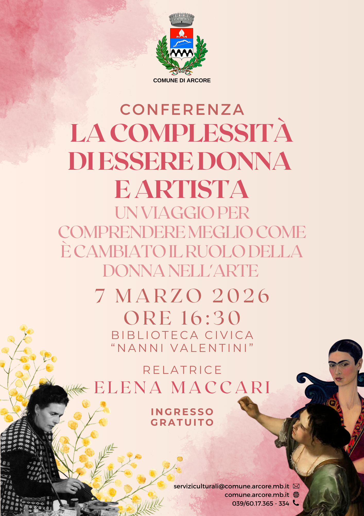 In occasione della Giornata Internazionale della Donna, il Comune di Arcore organizza la conferenza “La complessità di essere Donna e artista”, tenuta dalla Dott.ssa Maccari, dedicata all’evoluzione del ruolo della donna nel mondo dell’arte.
