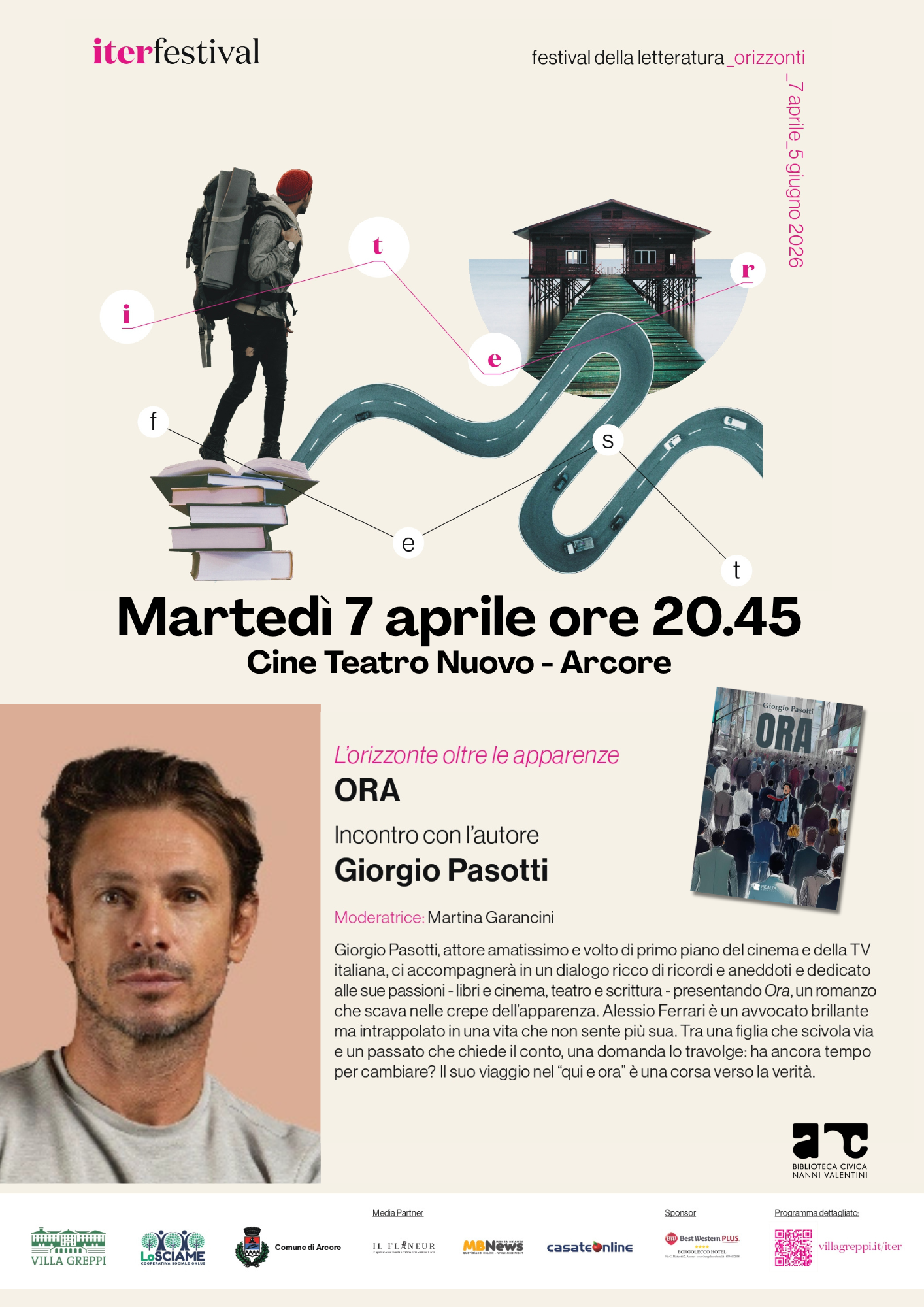 Giorgio Pasotti, attore amatissimo e volto di primo piano di cinema e TV, ci accompagnerà in un dialogo ricco di ricordi, aneddoti e dedicato alle sue passioni -libri, cinema, teatri e scrittura- presentando Ora, un romanzo che scava nelle crepe dell’apparenza. Alessio Ferrari è un avvocato brillante ma intrappolato in una vita che non sente più sua. Tra una figlia che scivola via e un passato che chiede il conto, una domanda lo travolge: ha ancora tempo per cambiare? il suo viaggio nel ”qui e ora” è una corsa verso la verità.