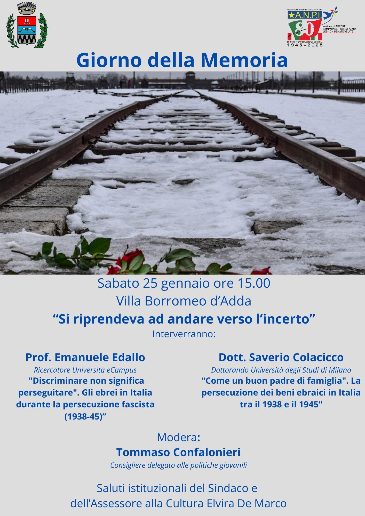 Per celebrare il Giorno della Memoria, Sabato 25 gennaio alle ore 15:00 il Comune di Arcore ha organizzato nel suggestivo contesto di Villa Borromeo d’Adda una conferenza dal titolo “Si riprendeva ad andare verso l’incerto”, durante la quale interverranno il Professor Emanuele Edallo, Ricercatore presso l’Università eCampus, e il Dott. Saverio Colacicco, Dottorando presso l’Università degli Studi di Milano. A moderare, il Consigliere delegato alle politiche giovanili Tommaso Confalonieri.