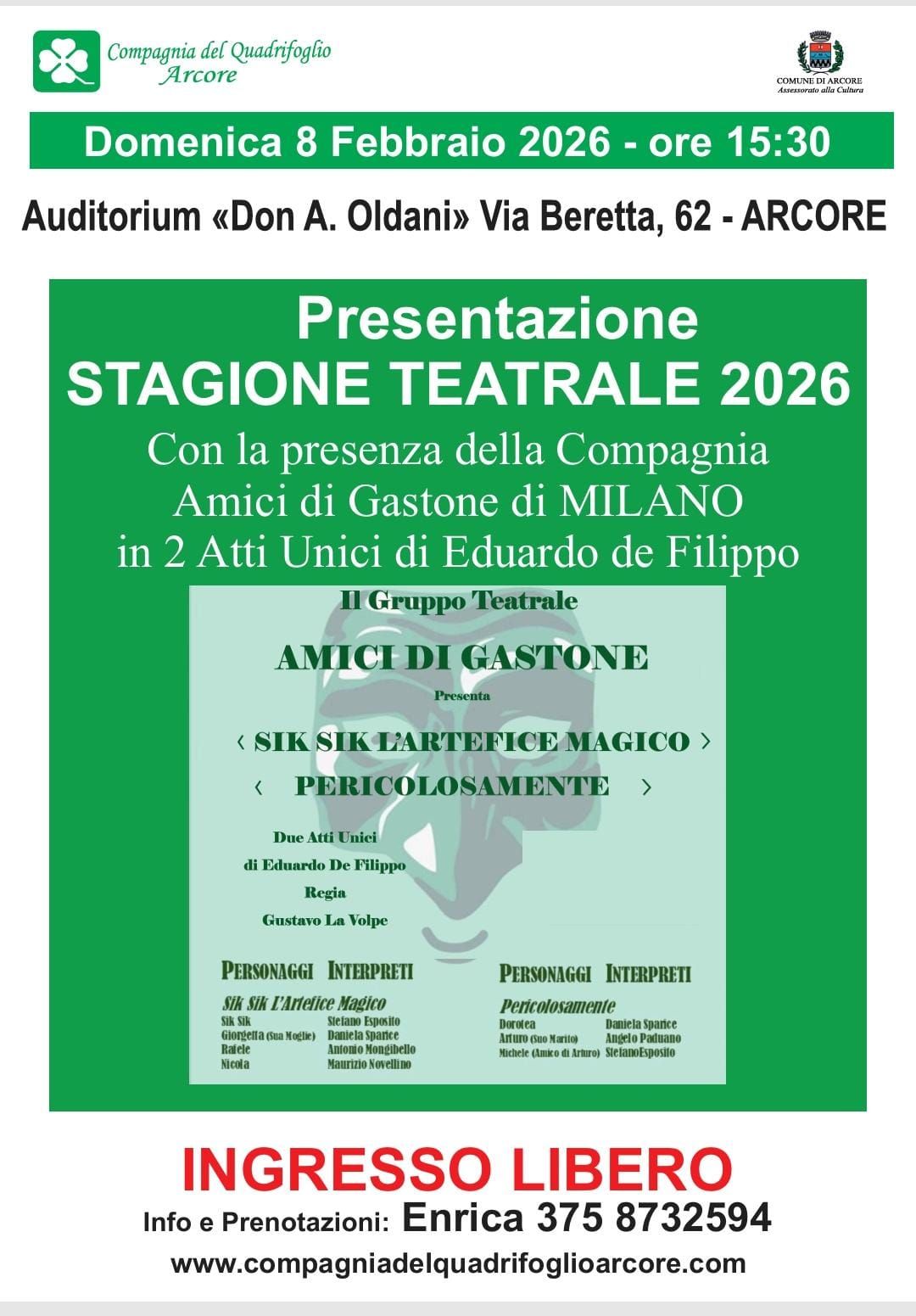 Domenica 8 febbraio 2026 ore 15:30, Presentazione della stagione teatrale 2026 della Compagnia del Quadrifoglio Arcore presso l’Auditorium “Don A. Oldani” di Arcore.